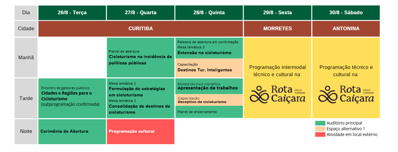 O Encontro desse ano toma o Paraná como cenário, em que a discussão será sobre a temática de políticas públicas para o cicloturismo. Os painéis e oficinas serão conduzidos por diversas pautas, e a programação se dividirá nos formatos a seguir.